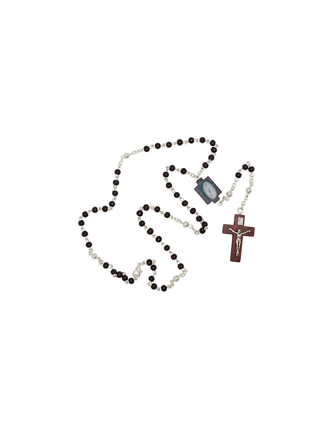Rosenkranz mit mehrfarbig irisierenden roten Perlen aus facettiertem Glas, montiert auf einer Kette aus versilbertem Metall. Die Medaille ist mit dem Gesicht der Heiligen Jungfrau und einem Ave Maria geprägt.Perlen: 6 mmLänge: 47 cmGewicht: 46 gr.Code: 120048719