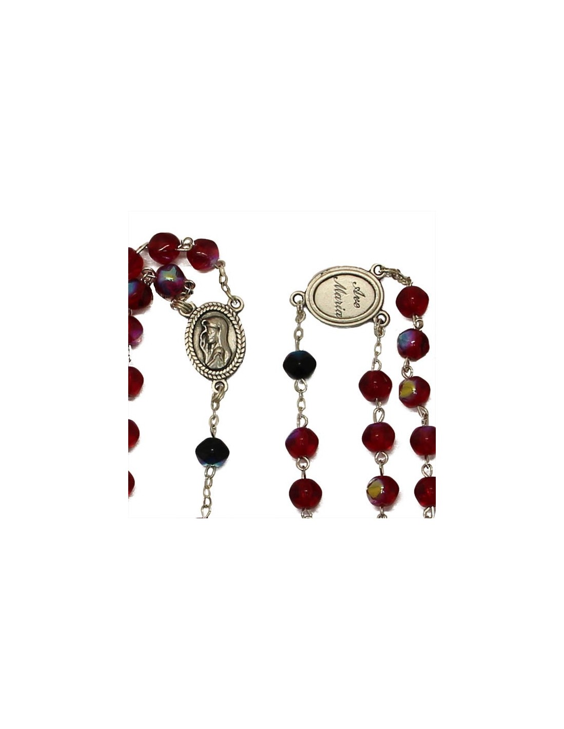 Price only for resellersRosenkranz mit mehrfarbig irisierenden roten Perlen aus facettiertem Glas, montiert auf einer Kette aus versilbertem Metall. Die Medaille ist mit dem Gesicht der Heiligen Jungfrau und einem Ave Maria geprägt.