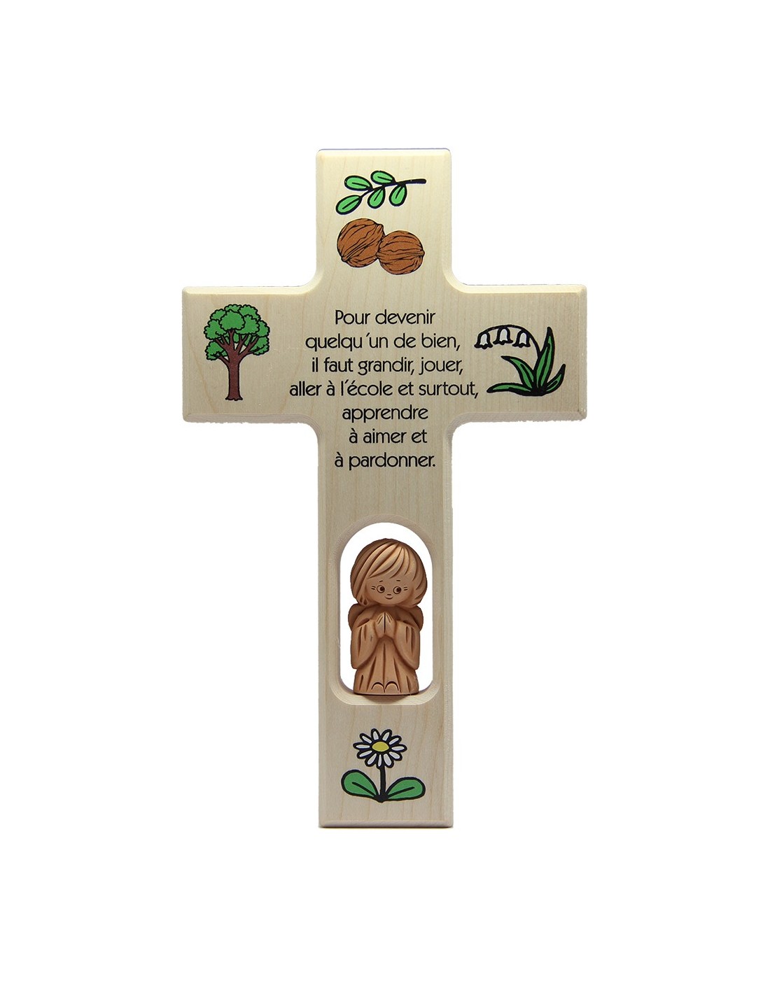 Price only for resellersHolzkreuz mit einem kleinen Terrakotta-Engel für Kinderzimmer mit Text verziert: