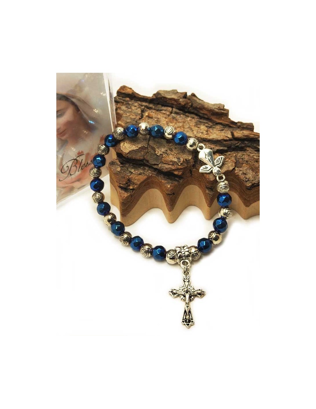 Dieses elastische Armband mit glänzenden blauen und silbernen Perlen, die in Rosen geschnitten sind, ist mit zwei kleinen Anhängern verziert: einem niedlichen Engel mit einem Herz und einem Kreuz mit Jesus darauf. Geschützt durch ein wunderschönes transparentes Gehäuse, wird das Armband von einem Bild der Muttergottes von Medjugorje begleitet. Das Armband kann auch als Dizainier verwendet werden.