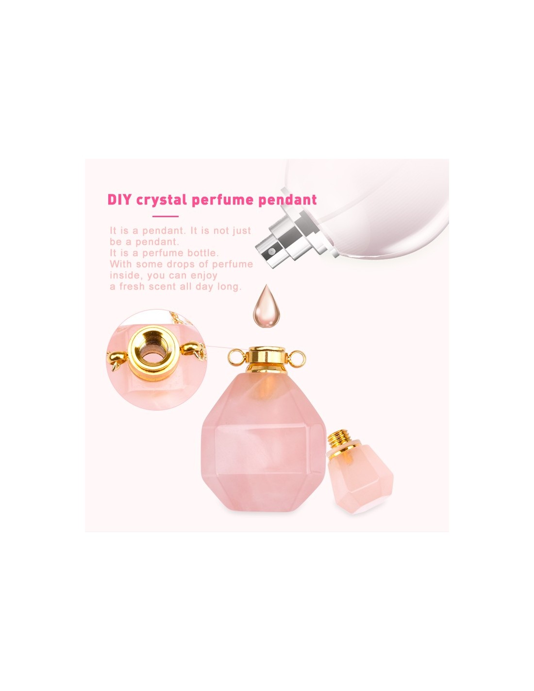 Diese Halskette vereint Originalität, Wohlbefinden und Schönheit! Das kleine Parfümfläschchen, das als Anhänger dient, ist aus Rosenquarz gefertigt, dem Stein der bedingungslosen Liebe zu sich selbst und zu anderen, und ermöglicht es Ihnen, ein paar Tropfen Ihres Lieblingsparfüms darauf zu geben. Mit der mitgelieferten Pipette lässt sich die Flüssigkeit leicht von einer Flasche in die andere umfüllen. Wenn Sie das Parfüm etwas mehr aus dem Flakon herauslassen möchten, entfernen Sie die kleine Silikonlasche unter dem Verschluss.