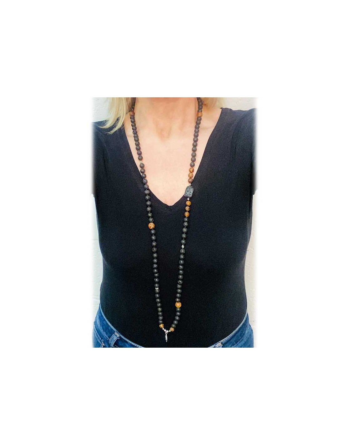 Diese lange Mala-Halskette aus Lavasteinen und Achat kann nach Belieben gestaltet werden! Möchten Sie einen lässigen Stil? Tragen Sie sie einfach um den Hals. Möchten Sie es lieber etwas dezenter? Machen Sie einen doppelten Halsring, um eine zweireihige Halskette zu kreieren. Möchten Sie einen eher böhmischen und selbstbewussten Stil? Dann legen Sie sie um Ihr Handgelenk und machen Sie daraus ein mehrreihiges Armband. So können Sie Ihren Look im Handumdrehen verändern!