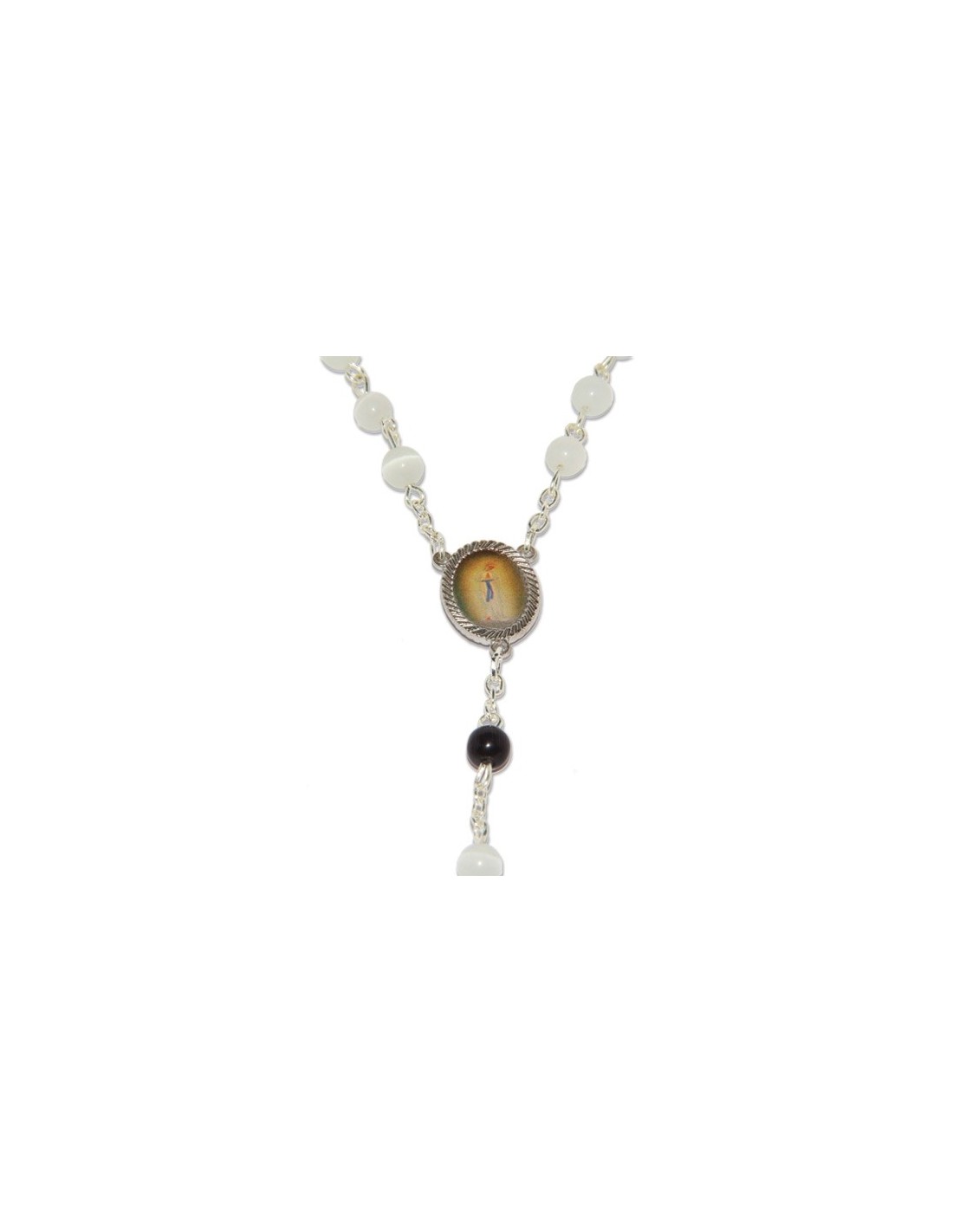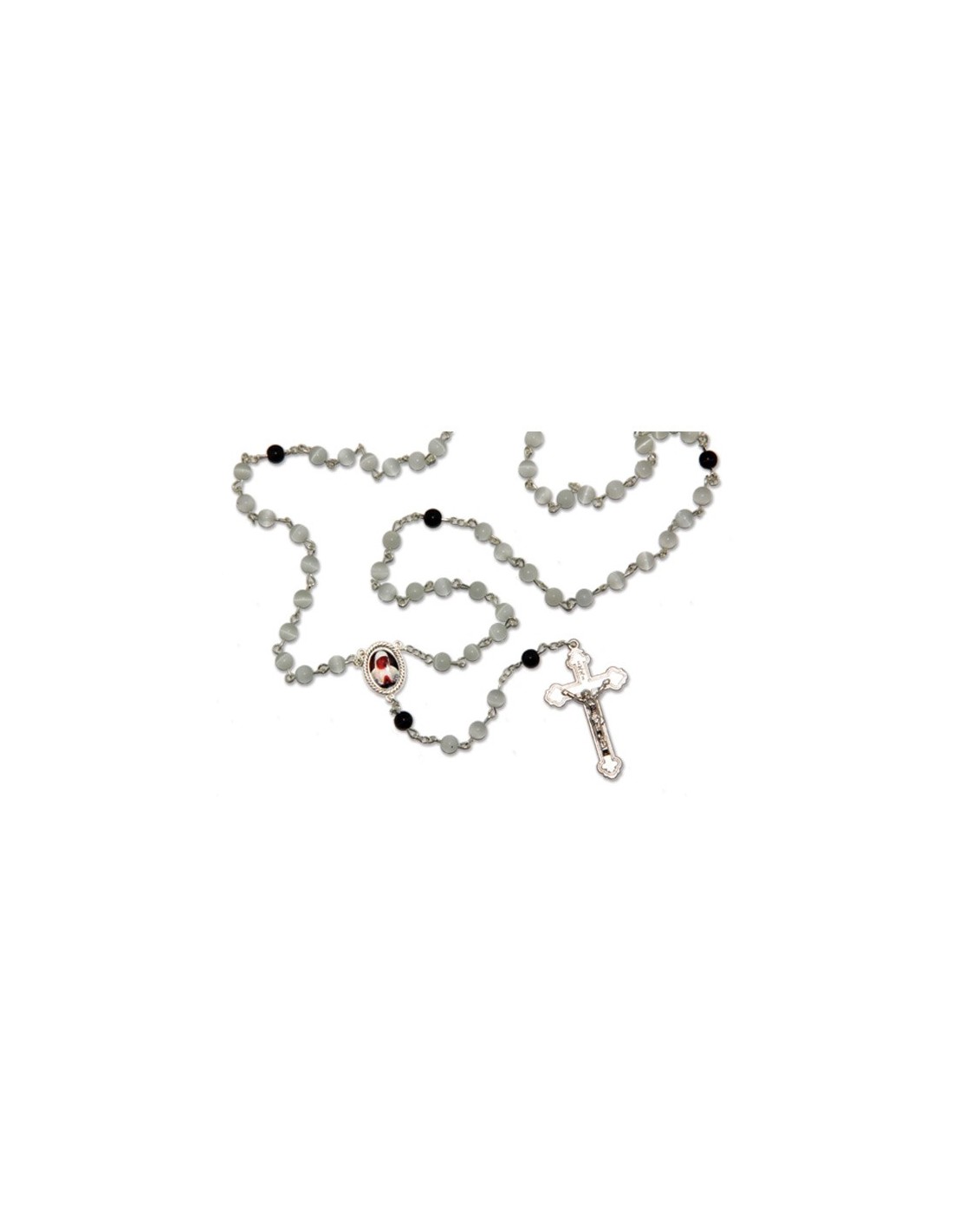 Geschenk-Box mit Perlen in silberfarbener Metall, Perlweiß Perlen und Medaille. Bild des Herzens und der Engel-Medaille Bild Medaille 20mm Rosenkranz 46 cm Perle: 8mm Gewicht: 60g Code: 11910-3
