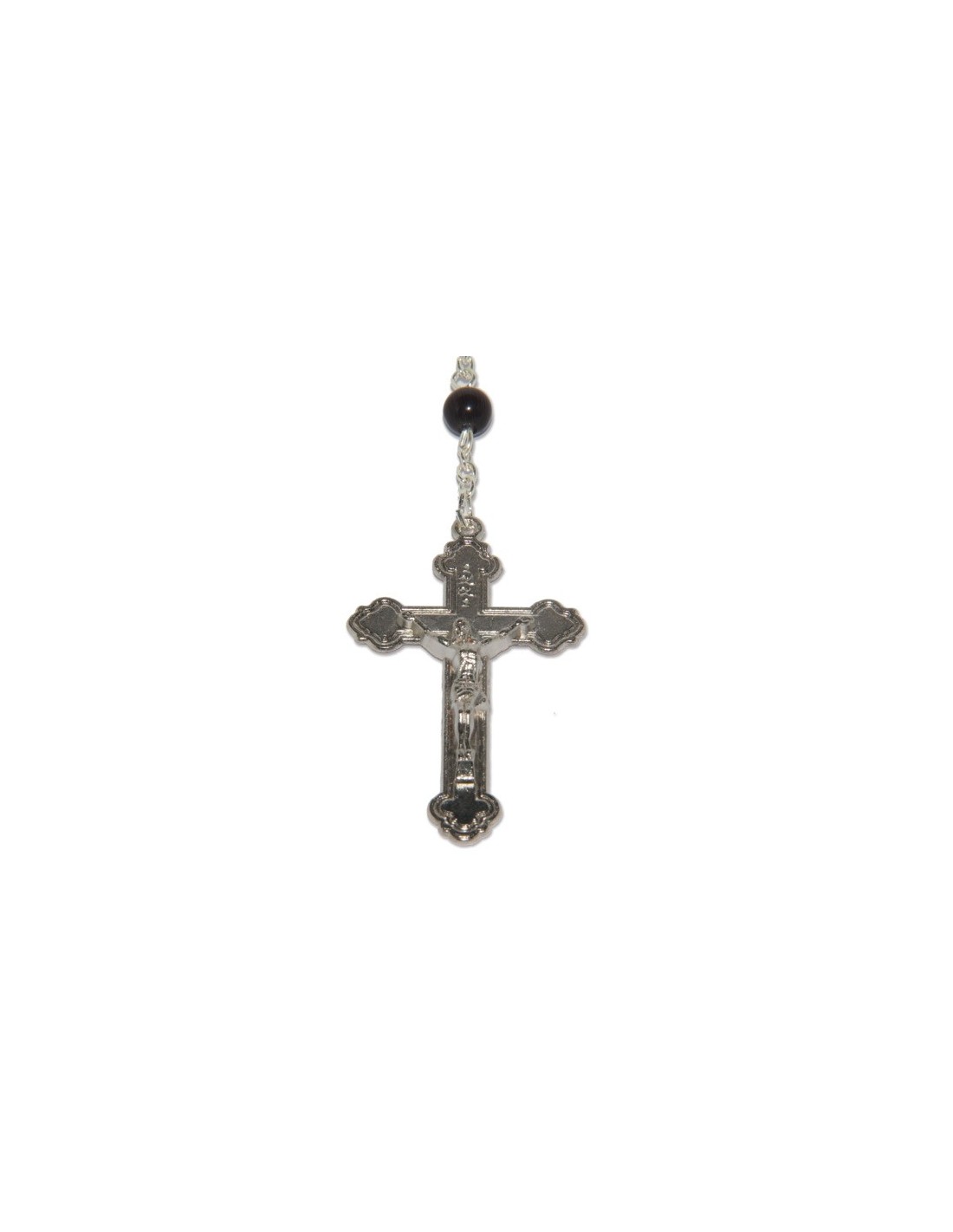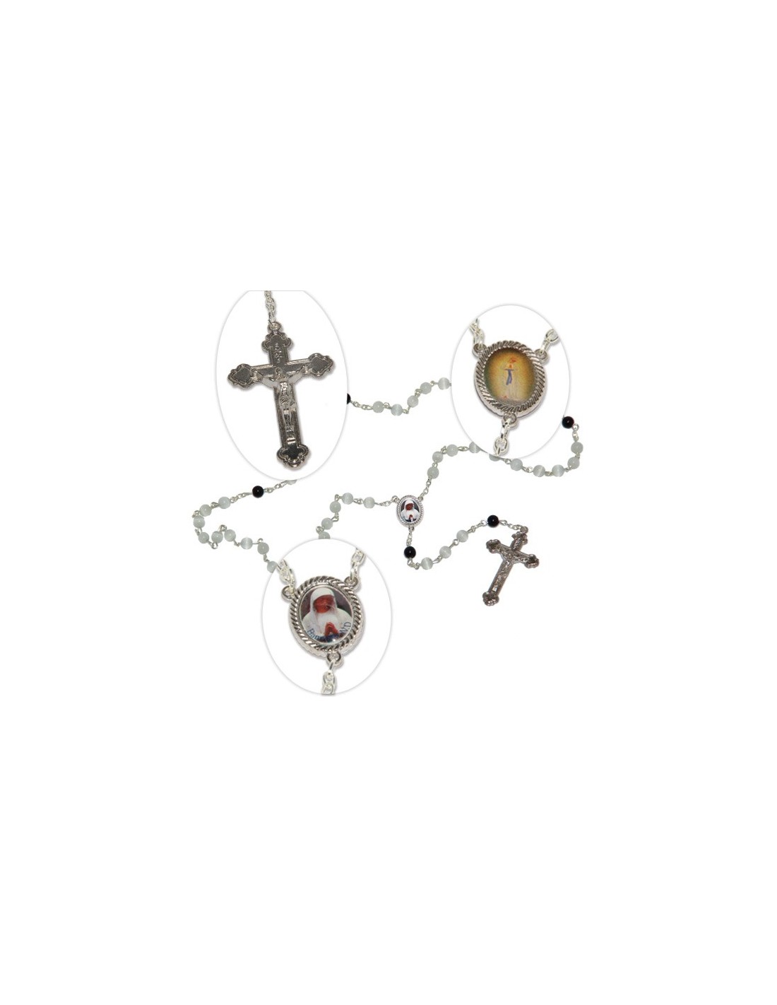 Rosenkranz mit mehrfarbig irisierenden roten Perlen aus facettiertem Glas, montiert auf einer Kette aus versilbertem Metall. Die Medaille ist mit dem Gesicht der Heiligen Jungfrau und einem Ave Maria geprägt.Perlen: 6 mmLänge: 47 cmGewicht: 46 gr.Code: 120048719