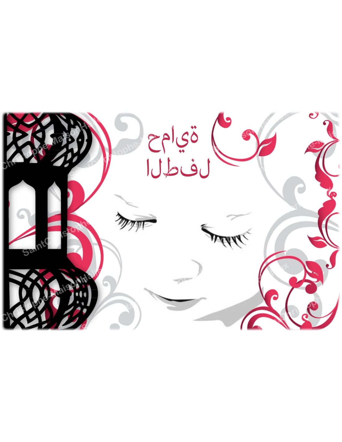 The sticker is decorated with a serene child's face surrounded by patterns and arabesques, with the words “Protection Children” written in Arabic.