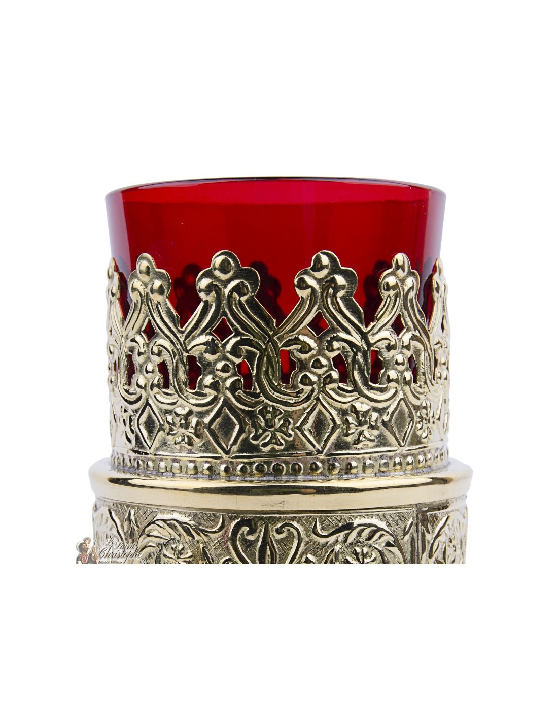Greek oil lamp, also called orthodox oil lamp, with red glass and gilded metal base. Beautifully carved, the oil lamp is a symbol of the Orthodox Christians, representing the Light with which Jesus Christ illuminates our souls. Of modest size, this candlestick can be used in church for ceremonies as well as for decoration, spiritual or personal.