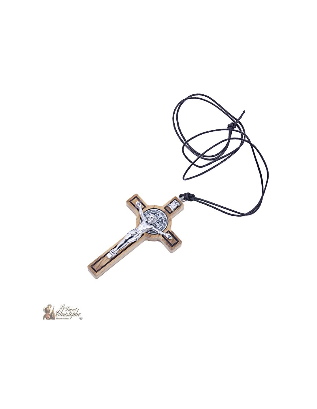 This necklace in braided cord is provided with a pendant in olive wood in cross of Saint Benedict. This cross has the particularity of having a medal of Saint Benedict behind the head of Christ, a very powerful symbol of protection and healing. The metal parts are silver: the figure of Christ, the medal and the scroll INRI. The olive wood is slightly colored to highlight the shapes of the cross.