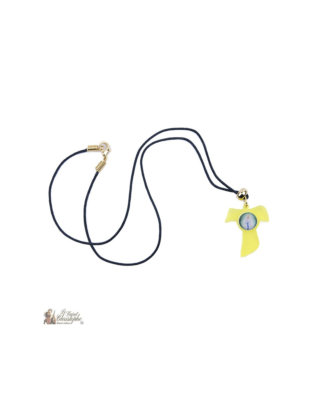 Necklace with Tau sign in yellow plexi and image of the Virgin of Banneux