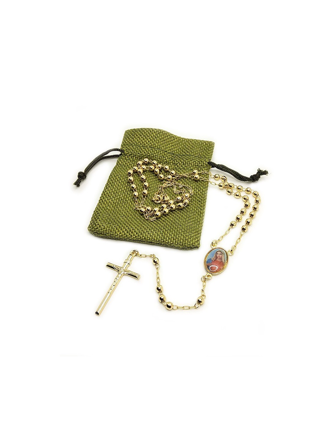 Price only for resellersSacred Heart of Mary rosary in 14k gold plating, with snap fastener for attaching as a necklace. The central Sacred Heart of Mary medal is in full color, engraved with a cross on the back. Sold with a pouch for storage.