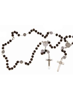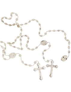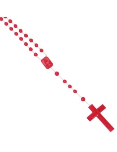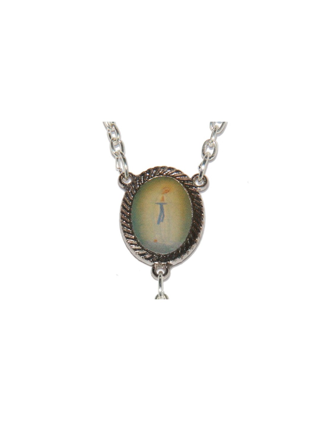 Rosario del Sagrado Corazón de María chapado en oro de 14 quilates, con cierre de langosta para engancharlo como collar. Medalla central del Sagrado Corazón de María en color, grabada con una cruz en el reverso. Se vende con una bolsita para guardarla.