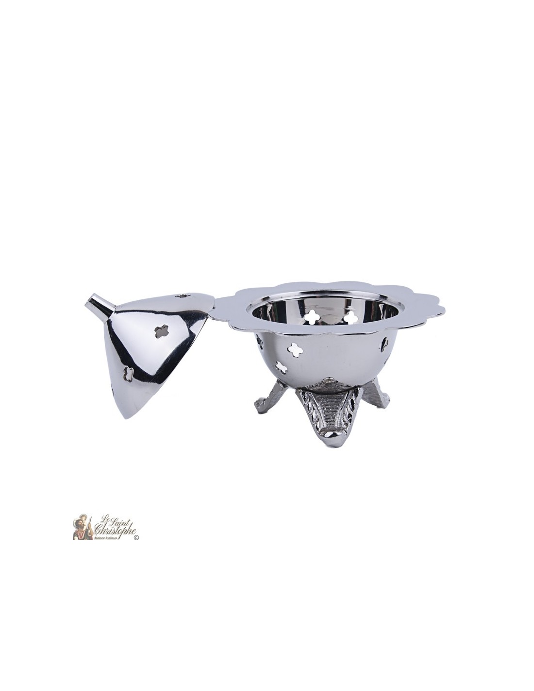 Este incensario de cobre dorado lleva grabado en su superficie un bello friso vegetal y floral. La tapa tiene un agarre alto y fácil. Los orificios están tallados en forma de cruz redondeada. El incensario también contiene una rejilla para colocar los trozos de incienso y los granos.Altura: 12 cm.Diámetro : 10 cm.Peso : 490 gr.Código : 541000167632