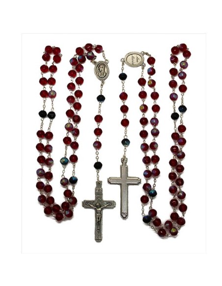 Price only for resellersRosario de cuentas rojas iridiscentes multicolores de vidrio facetado, montado sobre una cadena de metal plateado. La medalla presenta el rostro de la Santísima Virgen y un Ave María.