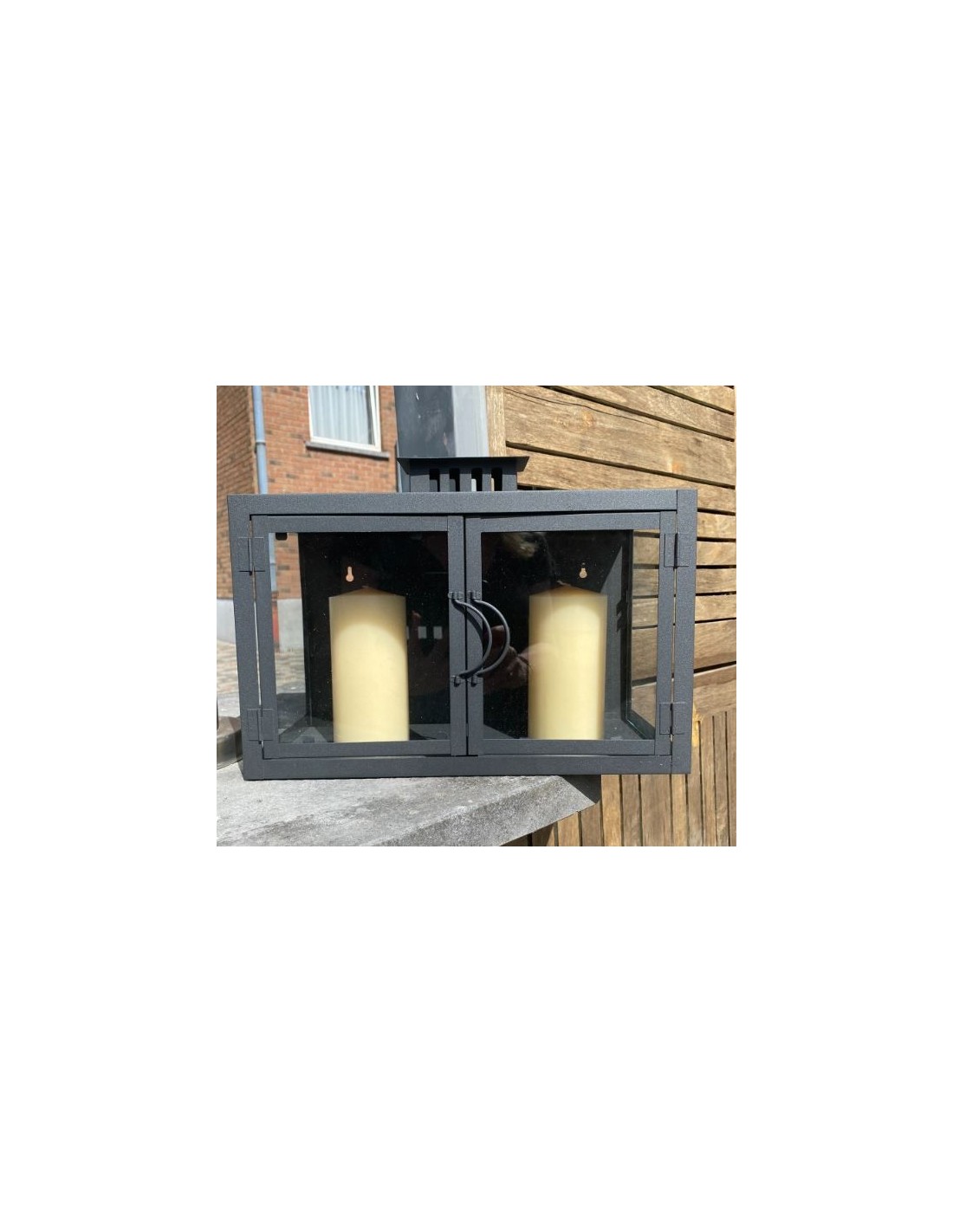 Price only for resellersUna gran linterna rectangular de cristal con dos puertas y dos candelabros.