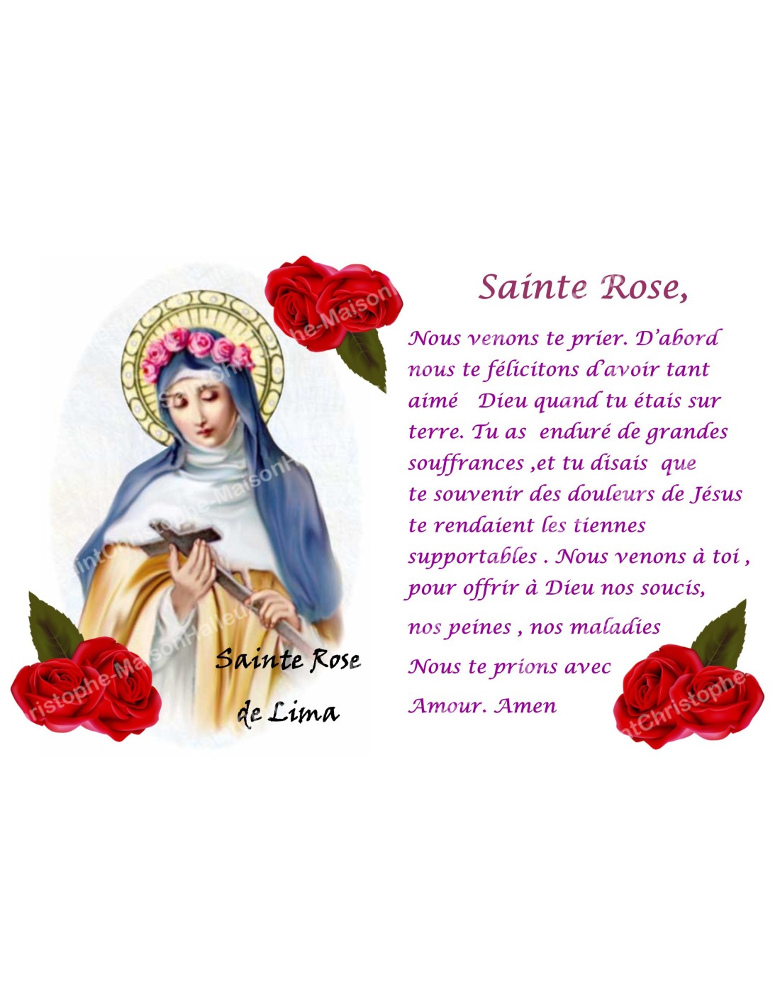 La pegatina tiene la imagen de Santa Rosa de Lima, con una oración dedicada a ella rodeada de rosas rojas.