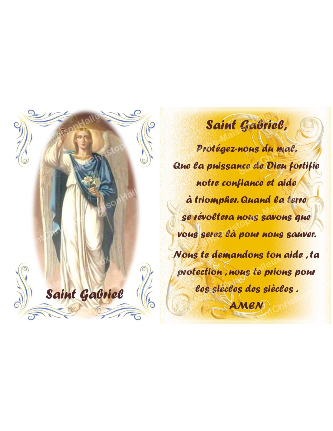 La pegatina tiene la imagen del arcángel San Gabriel, con una oración dedicada a él sobre un fondo amarillo con motivos decorativos.