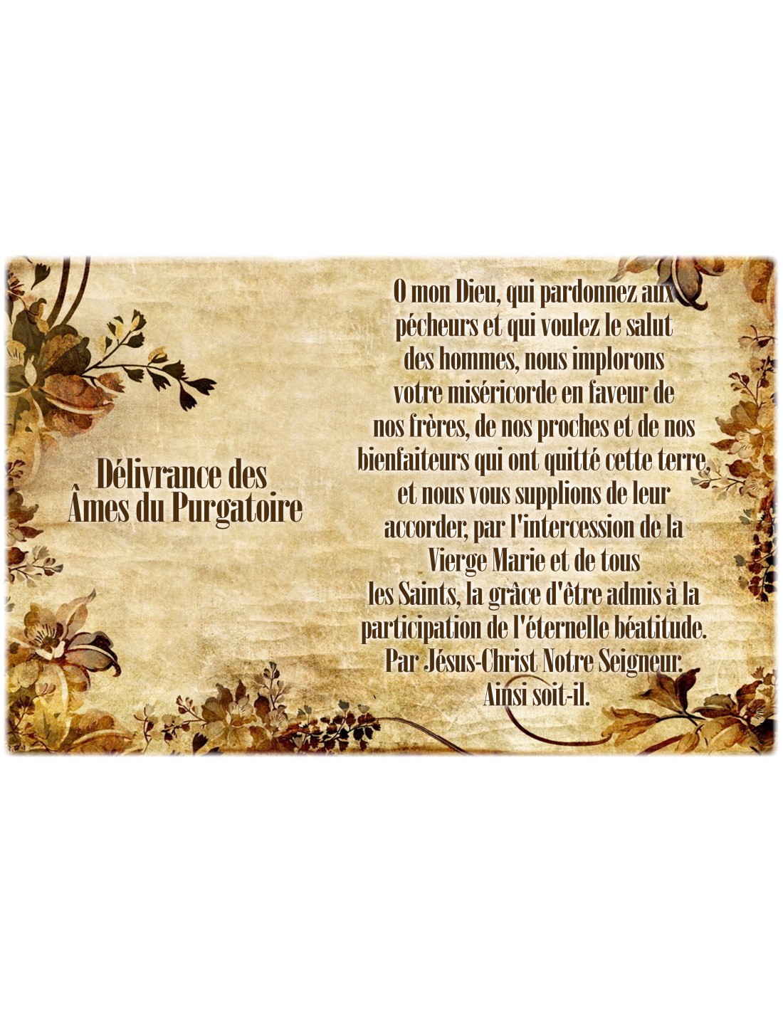 La pegatina tiene la imagen de un pergamino decorado con motivos vegetales y una oración dedicada a la liberación de las almas del purgatorio.