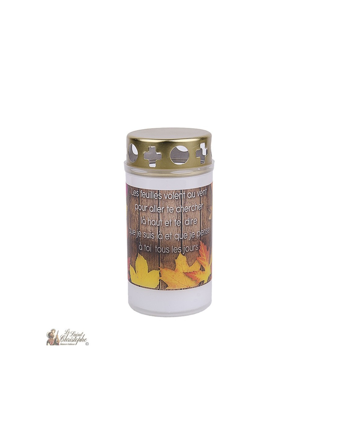 Vela blanca con tapa doradaVelas de noche con tapa de metal dorado abierta y ligeramente curvada.Tiempo de combustión: 72 horasDimensiones: 6 x 12,5 cmPeso : 190 gr
