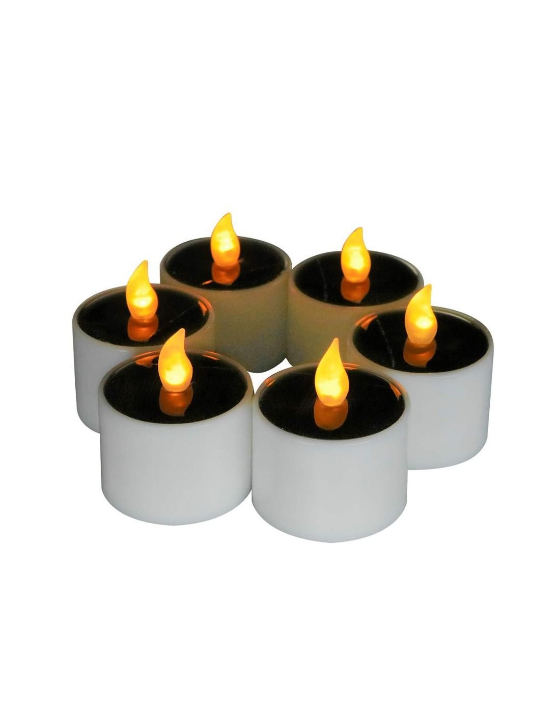 Velas LED con células fotovoltaicas. Estas pequeñas velas tienen una base blanca y una parte superior negra para limitar la visibilidad de las células solares. La llama es de plástico translúcido y la luz que emite es de un cálido amarillo parpadeante, imitando la llama de una vela real. Para una fiesta, una boda, un cumpleaños o la decoración interior de todos los días, estas velas harán las delicias del lugar con su cálido resplandor. De tamaño similar a las candelitas, pueden utilizarse en muchas superficies y también en el exterior: camping, piscina, playa, montaña...
