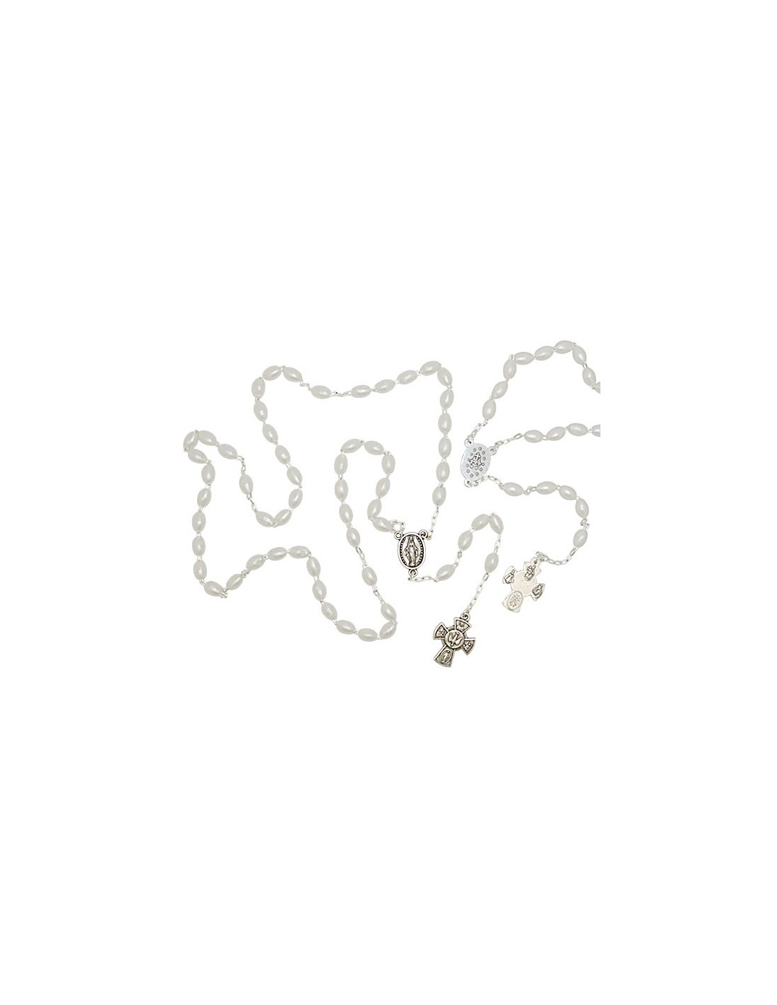 Chapelet en perles allongées blanches nacrées avec le coeur de la Vierge Miraculeuse et jolie croix avec différents Saints .