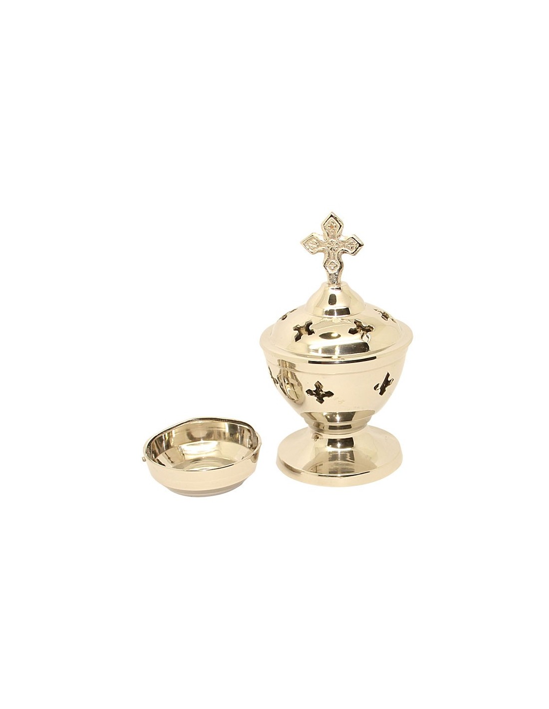 Price only for resellersEncensoir argenté, très belle finition, en 3 parties, couvercle, récipient intérieur pour le charbon, et socle avec croix sculptées.