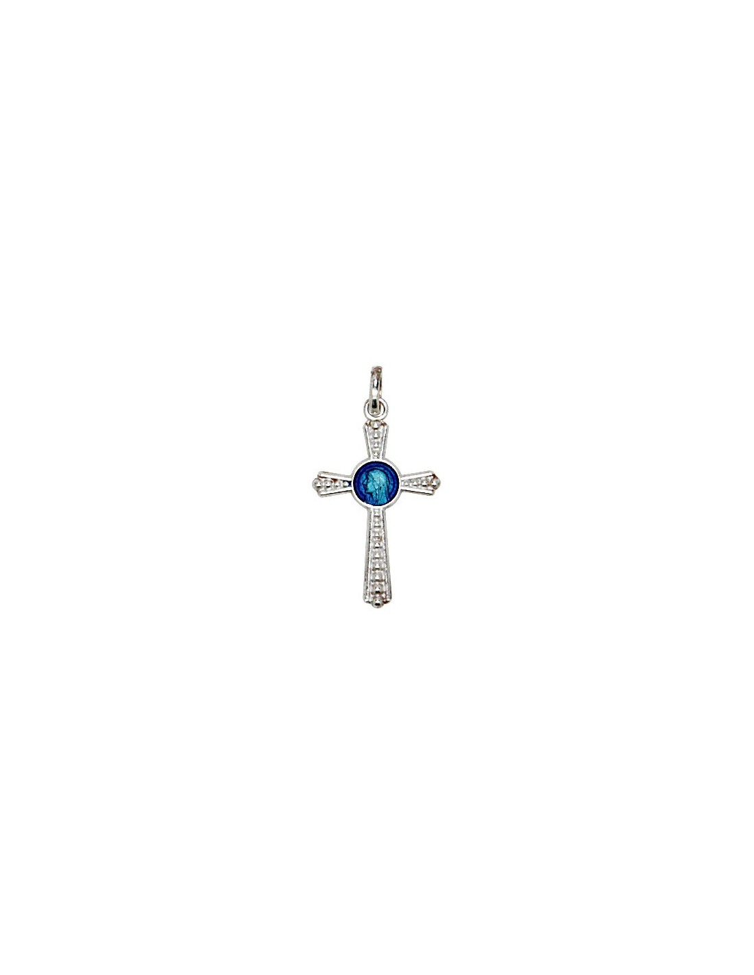 Price only for resellersPetite croix en argent véritable avce central médaille de la Vierge émaillée bleu .