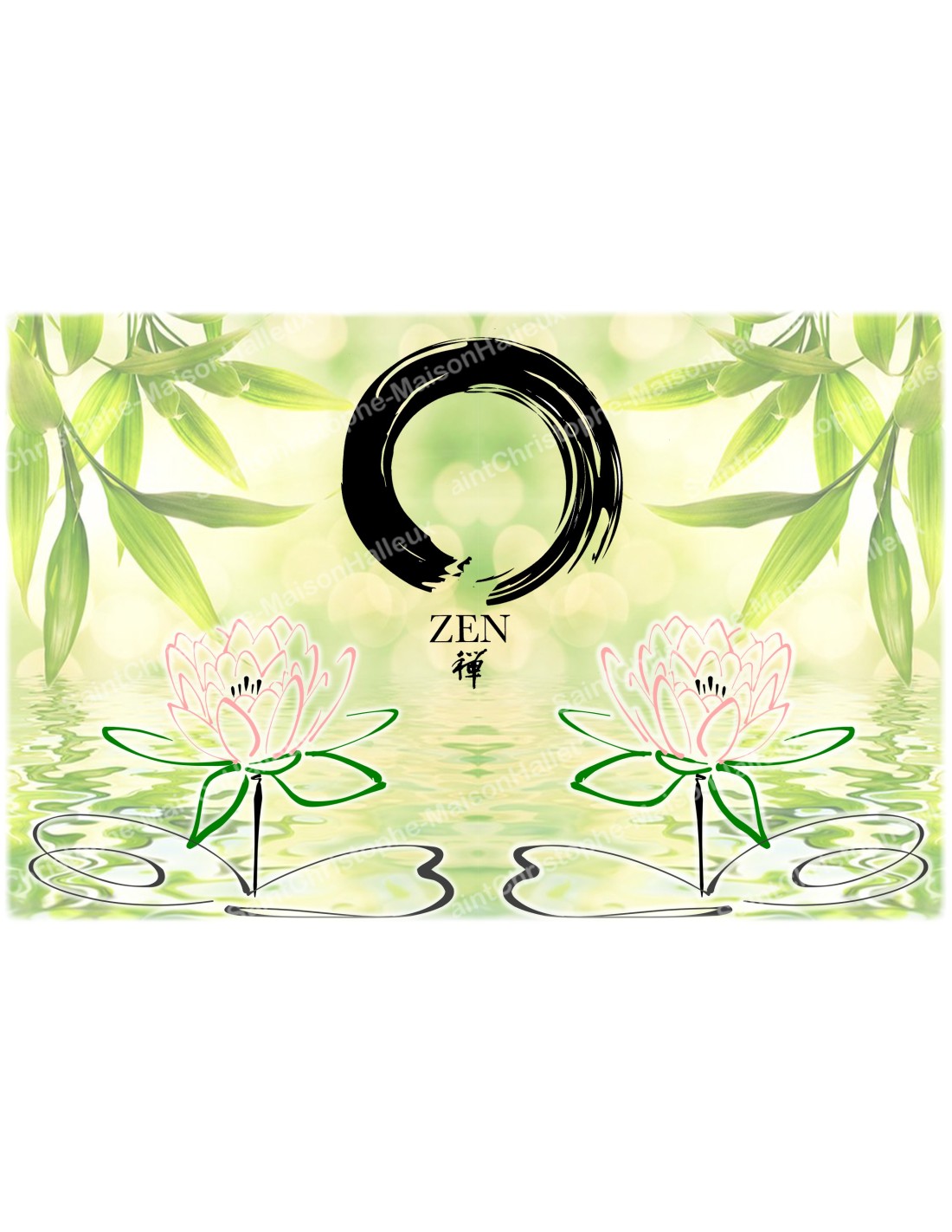 L'autocollant est illustré d'un plan d'eau avec deux fleurs de lotus et le symbole zen.