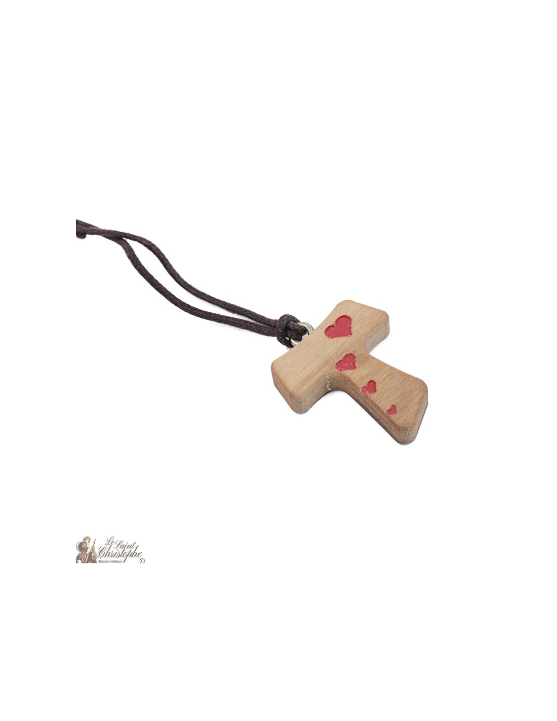 Price only for resellersPendentif du signe Tau en bois d'olivier avec coeurs rouges et cordon.