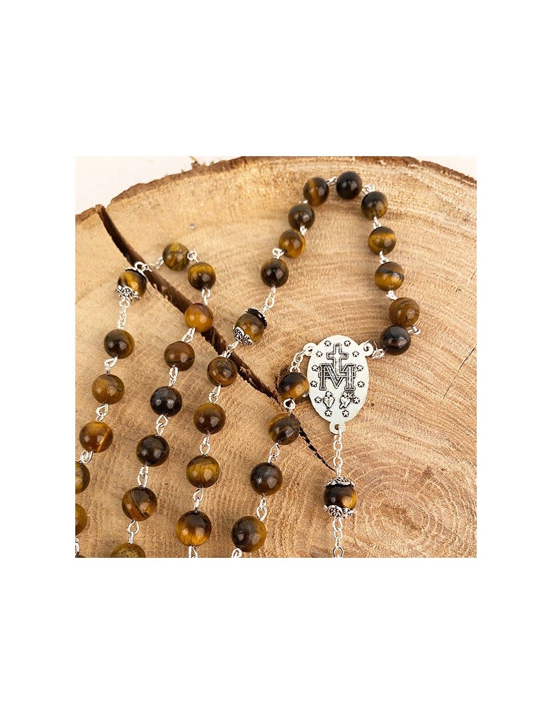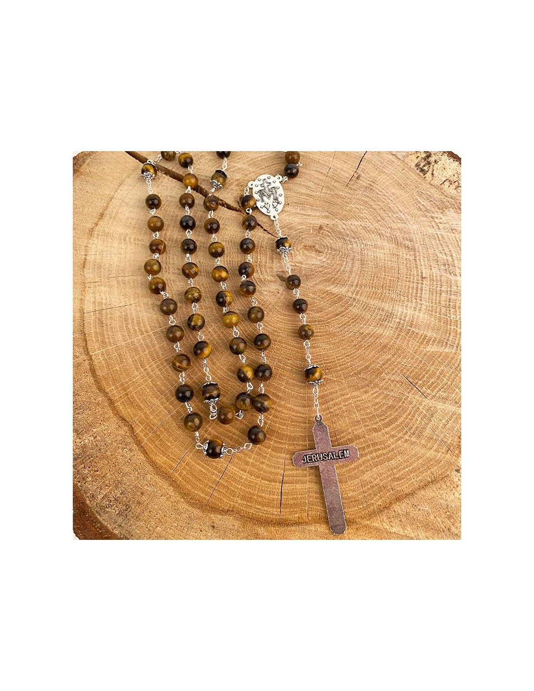 Chapelet monté sur chaîne en métal argenté, avec perles en œil de tigre. Pierre fine délicate, l'oeil de tigre est un minéral aux couleurs brun et ocre et aux reflets jaunes flamboyants et magnifiques. La médaille centrale du chapelet est dédiée à la Vierge Miraculeuse avec la mention "Ô Marie, conçue sans péché, priez pour nous qui avons recours à vous". Le dos de la médaille est frappé d'un symbole marial. La croix finement sculptée avec les traits de Jésus, pendentif de ce chapelet, est gravée au dos avec la mention Jérusalem. Le tout est conservé dans une belle boîte à l'intérieur de velours noir.