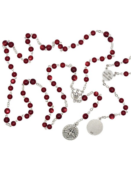 Rosario montato su catena in metallo argentato con perline a occhio di tigre. Il pezzo centrale è una medaglia alla vergine miracolosa con un simbolo mariano sul retro. La croce è in metallo e reca inciso il nome di Gerusalemme.Lunghezza: 58 cm
