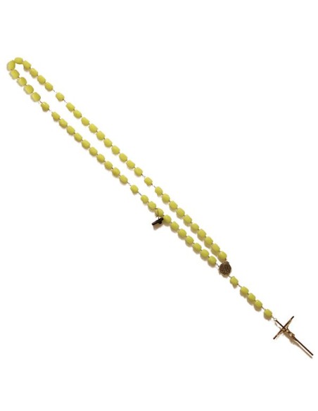 Rosario montato su catena in metallo argentato con perline a occhio di tigre. Il pezzo centrale è una medaglia alla vergine miracolosa con un simbolo mariano sul retro. La croce è in metallo e reca inciso il nome di Gerusalemme.Lunghezza: 58 cm