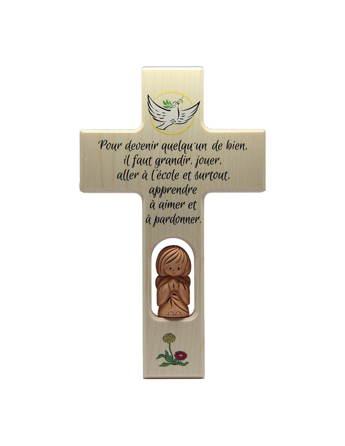 Price only for resellersCroce in legno decorata con un piccolo angelo in terracotta per la stanza dei bambini con testo: