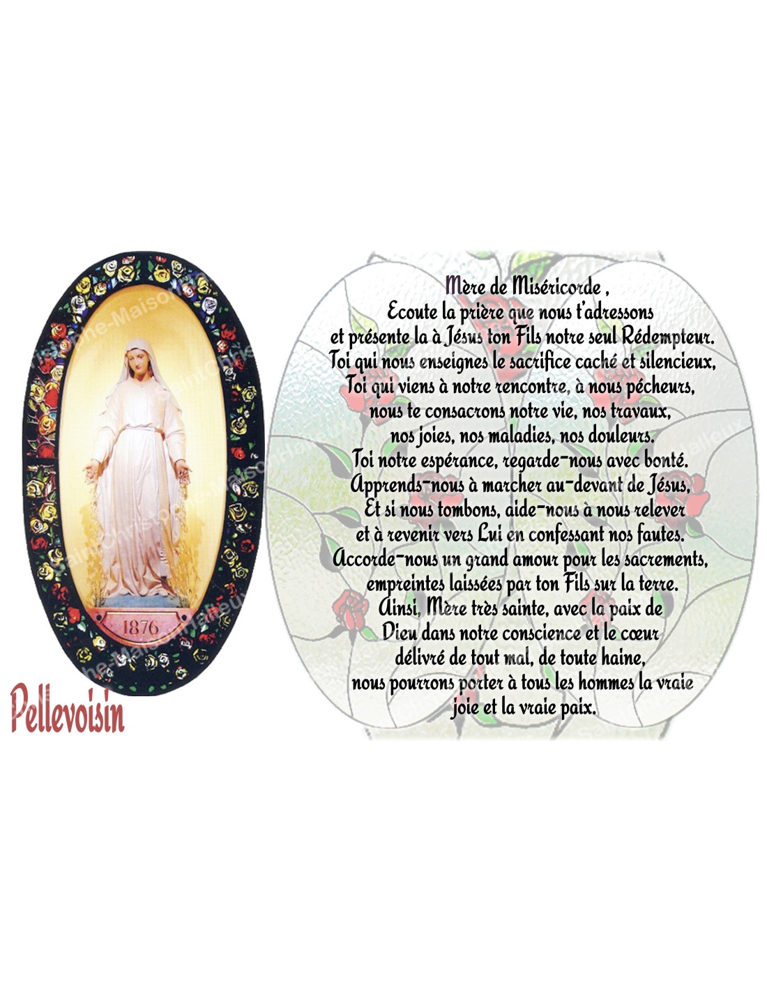 L'adesivo raffigura Notre Dame de Pellevoisin con una preghiera a lei dedicata su uno sfondo di vetrate floreali.