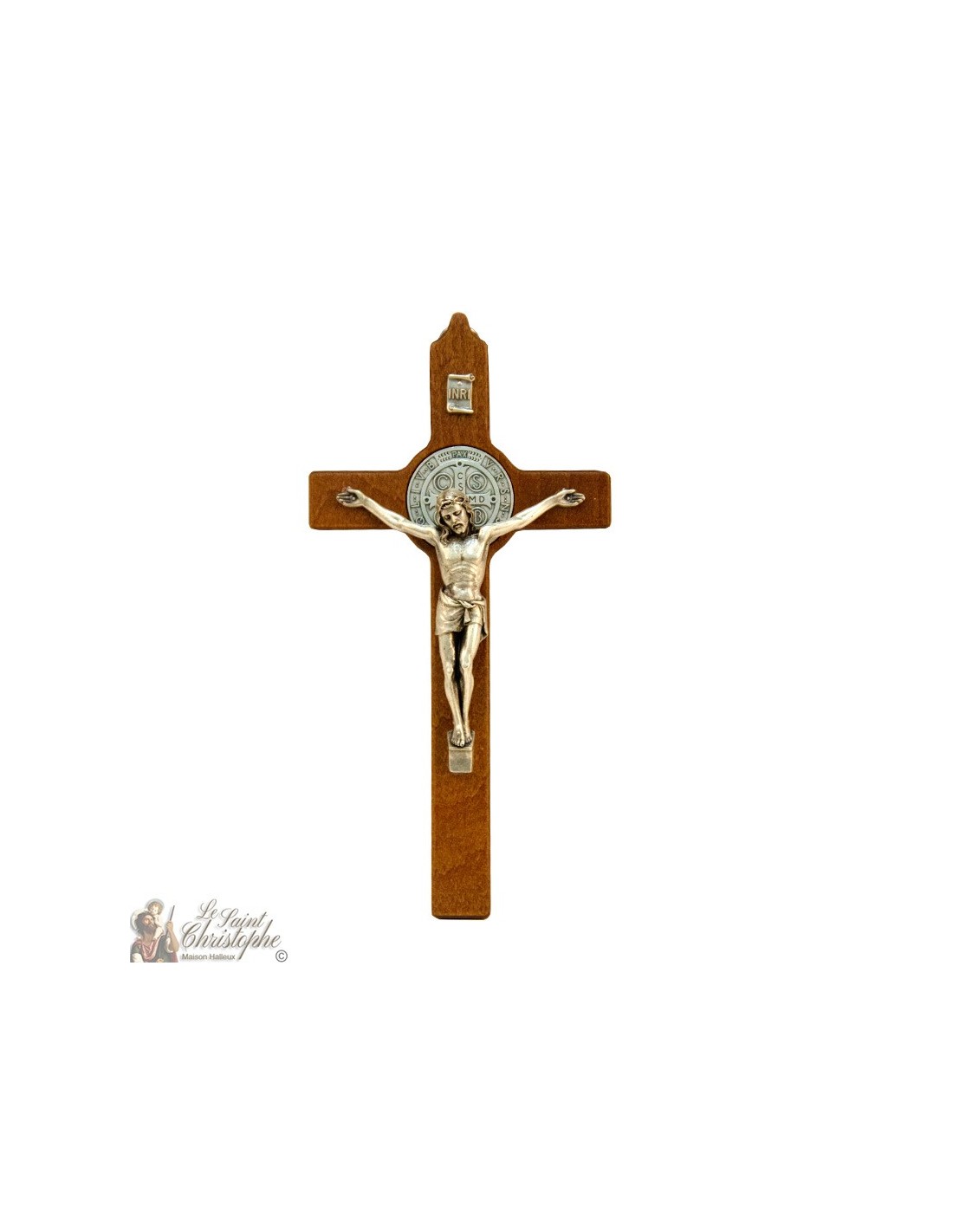 Croce da parete in legno scuro con curve semplici e sobrie. L'effigie di Gesù Cristo e la medaglia di San Benedetto, finemente scolpite, sono in metallo argentato. Questo crocifisso appeso ha anche un valore protettivo contro il male.