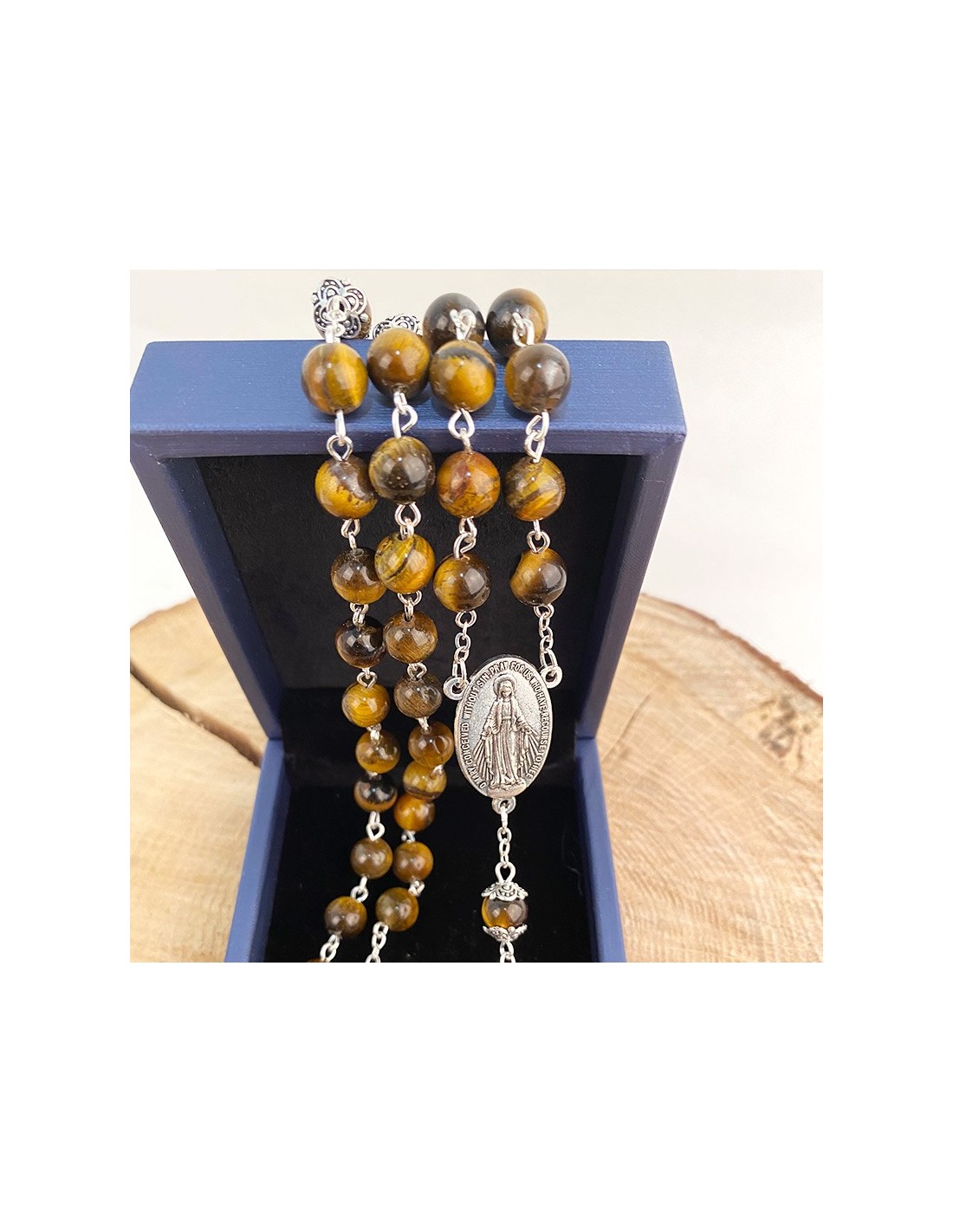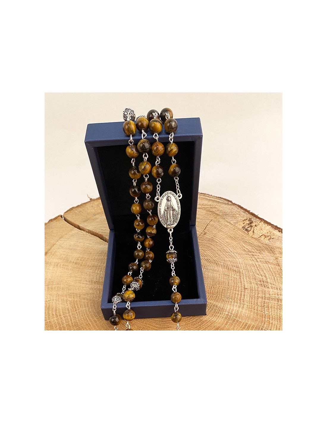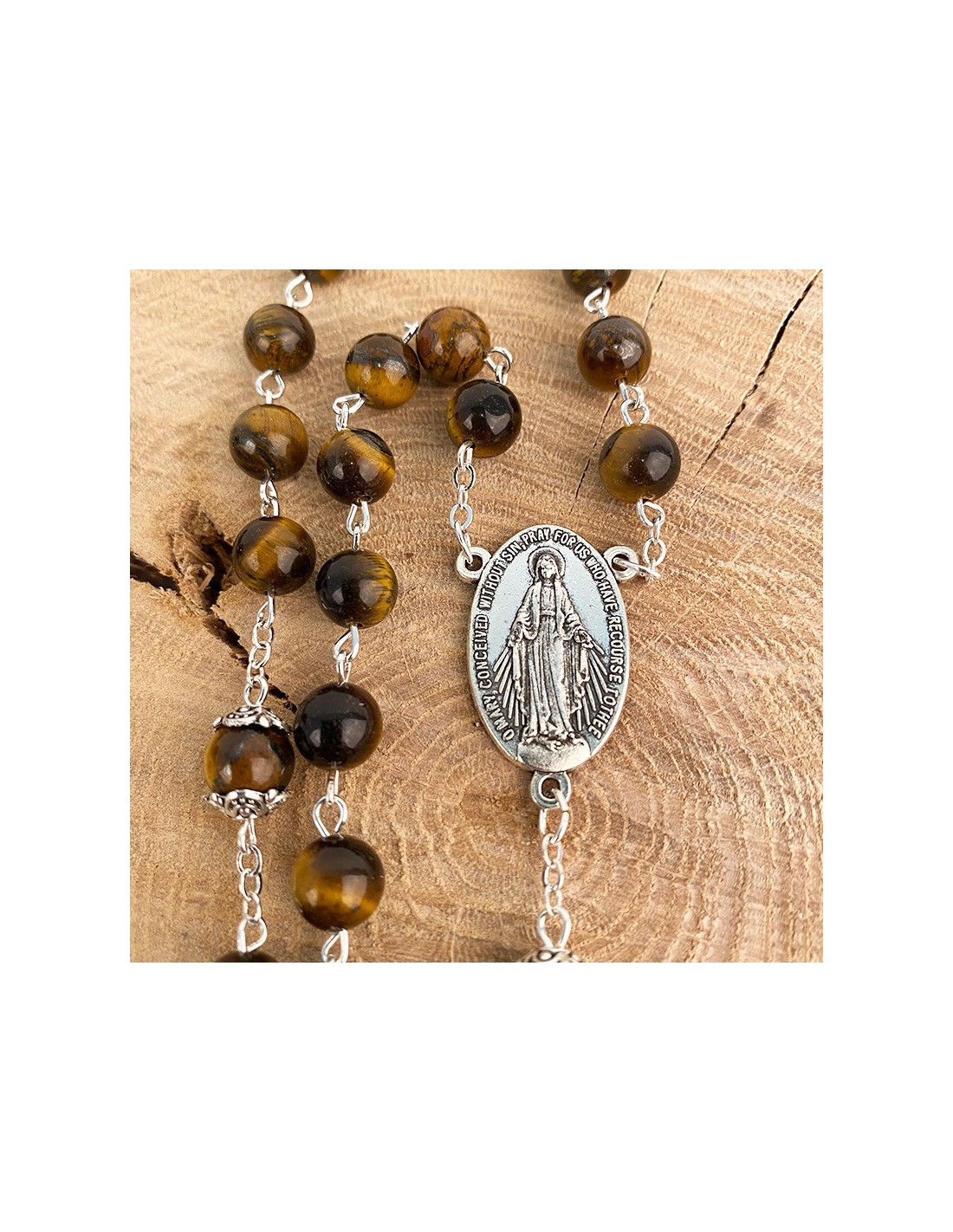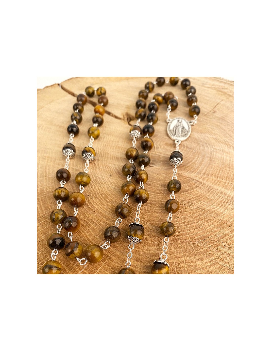 Rosario montato su catena in metallo argentato con perline a occhio di tigre. Pietra fine e delicata, l'occhio di tigre è un minerale dai colori bruni e ocra e dai magnifici riflessi giallo fiammeggianti. La medaglia centrale del rosario è dedicata alla Vergine Miracolosa con le parole "O Maria, concepita senza peccato, prega per noi che ricorriamo a te". Sul retro della medaglia è impresso un simbolo mariano. La croce finemente scolpita con le fattezze di Gesù, pendente di questo rosario, è incisa sul retro con la menzione di Gerusalemme. È conservato in una bella scatola all'interno di velluto nero.