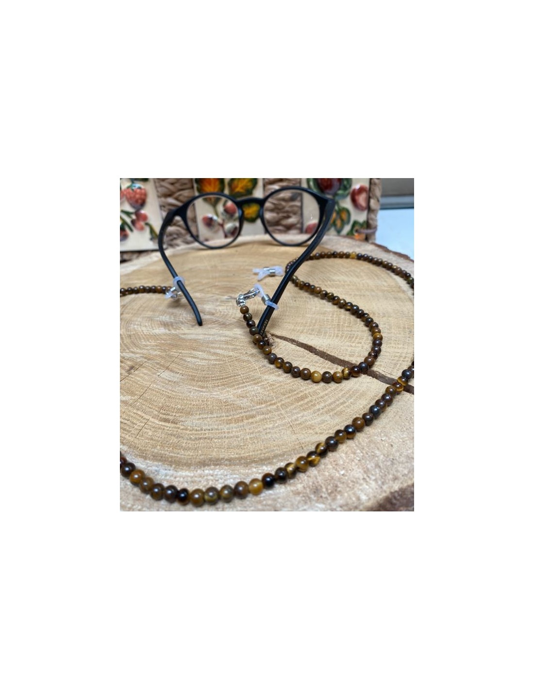 Questo cordoncino per occhiali è un accessorio elegante e pratico. Pratico per tenere gli occhiali senza doverli indossare, chic grazie alle perle di occhio di tigre, una pietra pregiata rinomata in litoterapia per le sue virtù.