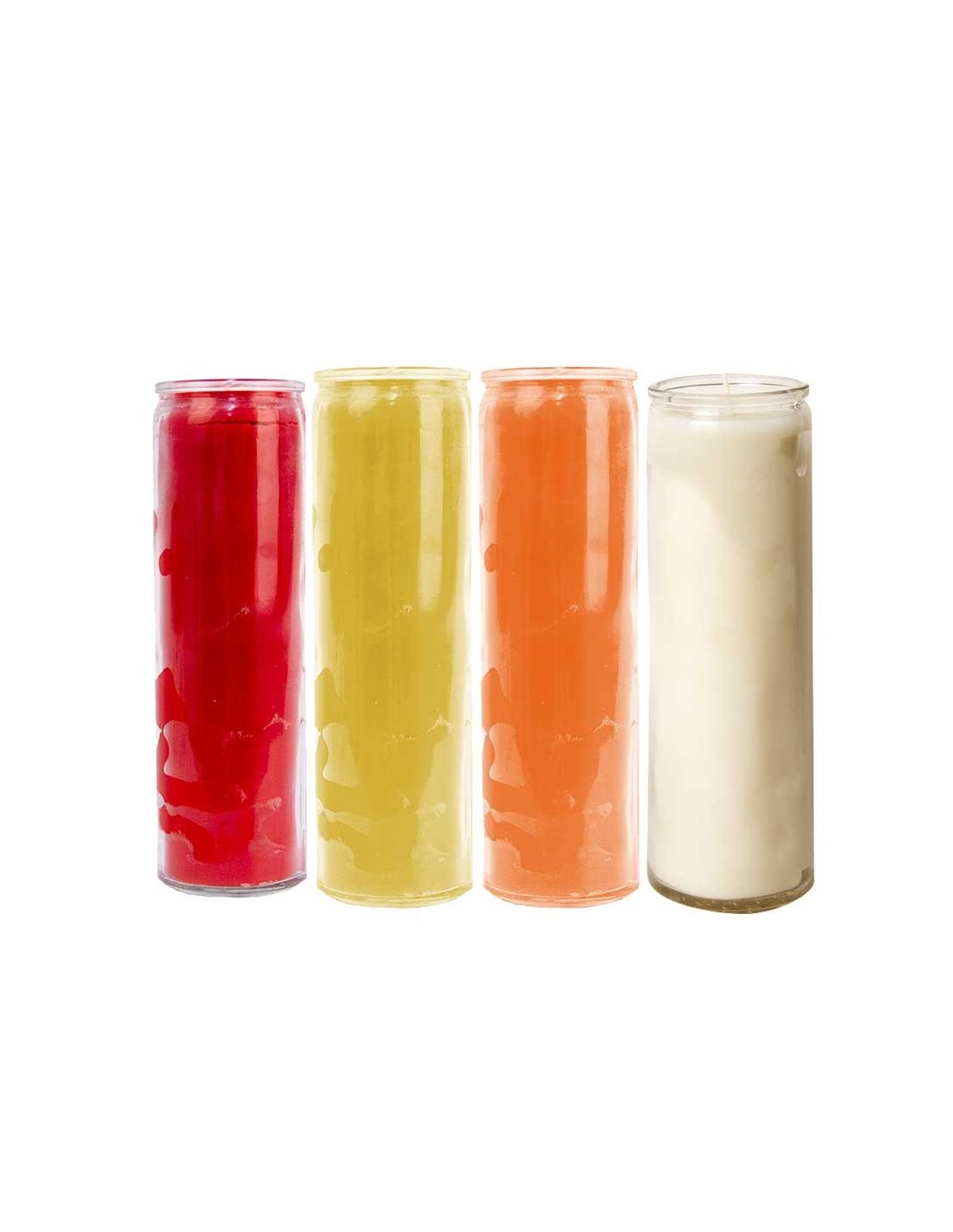 Candela in un solido contenitore di vetro, che può bruciare per 168 ore o una durata equivalente di 7 giorni. La paraffina, colorata in tutta la sua massa, scorre all'interno del contenitore, dando un effetto fotoforo durante la combustione, la fiamma che risplende attraverso il sottile strato di cera. La candela può essere utilizzata per il semplice piacere della decorazione o per usi più spirituali come la preghiera, la meditazione o l'esoterismo.