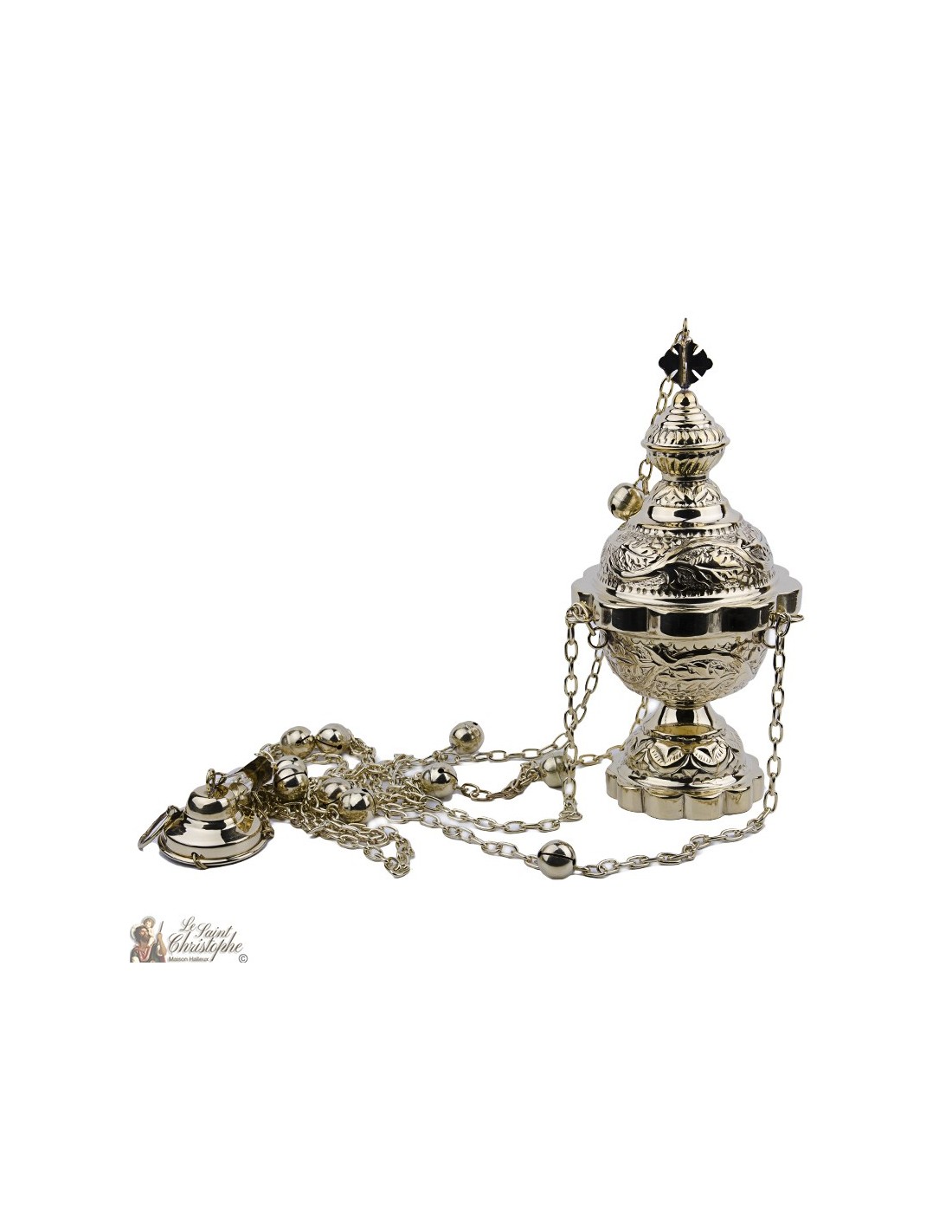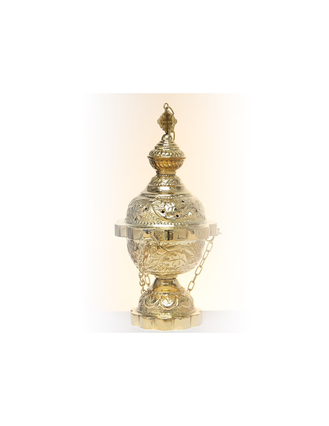 Dit wierookvat van verguld koper is op het oppervlak gegraveerd met een prachtig planten- en bloemenfries. Het deksel heeft een hoge, gemakkelijke greep. De gaten zijn in ronde kruizen gesneden. De wierookbrander bevat ook een rooster om de wierookstukjes en -korrels in op te bergen.Hoogte: 12 cm.Diameter : 10 cm.Gewicht : 490 gr.Code : 541000167632