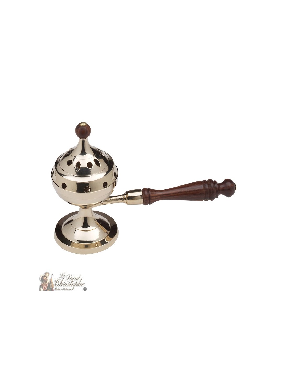 Censer op koperen standaard met lang houten handvat