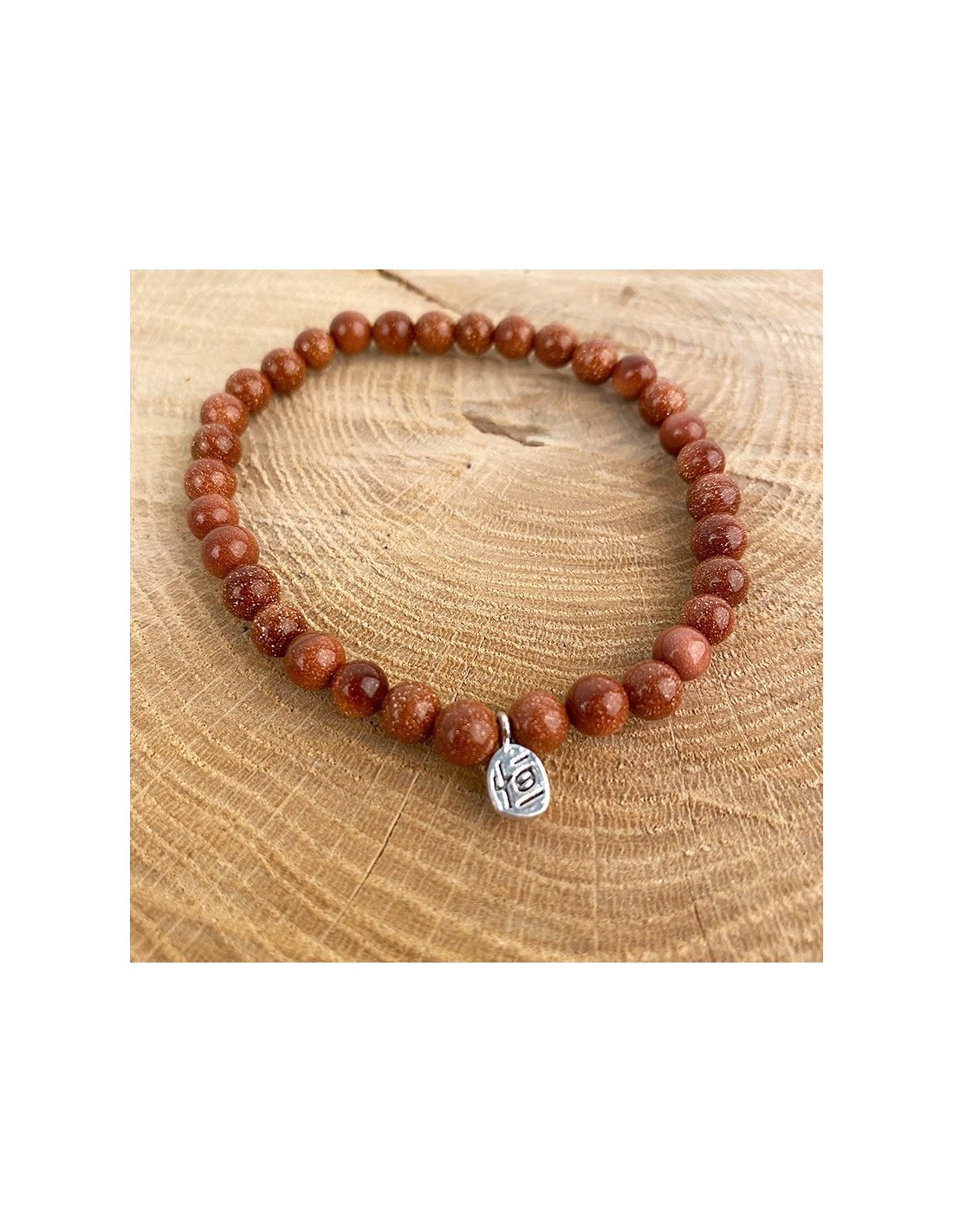 Roodbruin met glitters, de synthetische zonnesteen (goudsteen) is een energetische steen die de bloedsomloop en het hart versterkt en zuivert. Het is een warme steen, vol energie en brengt vreugde, geluk, vriendschap en ontmoetingen. Het verspreidt vitaliteit en goed humeur naar de persoon die het draagt, en maakt de creatieve, maar ook fysieke en vleselijke krachten vrij.
