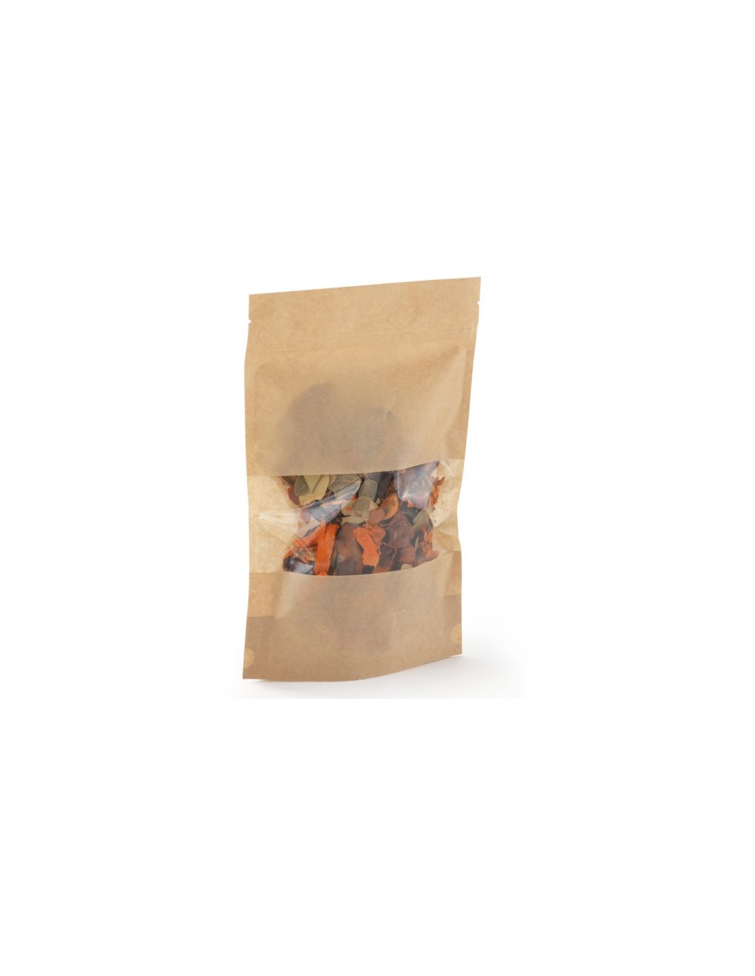 Price only for resellersBruine kraftpapierzak met transparant venster en gemakkelijke ritssluiting voor het verpakken van producten zoals vloeistoffen, poeders, korrels of andere monsters. Het kruisje onder de tas houdt de tas recht, zelfs als hij leeg is.