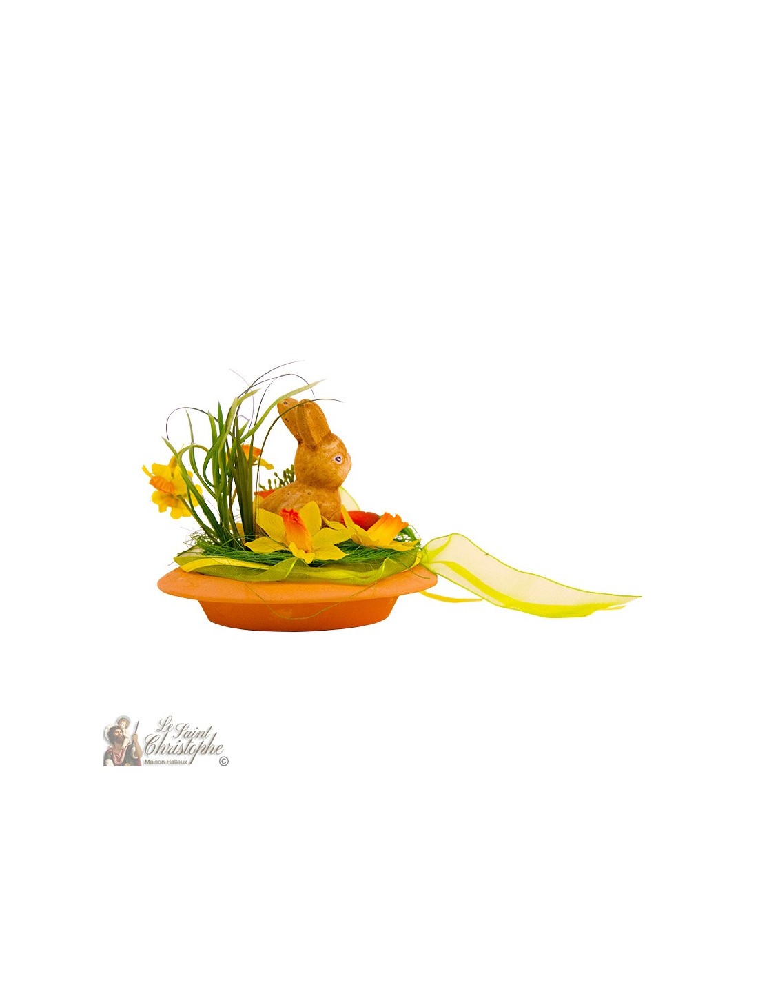 Price only for resellersTafeldecoratie, een terracotta schoteltje versierd met een konijntje en kunstbloemen, linten, wortel en kruiden. Een mooie paasdecoratie!