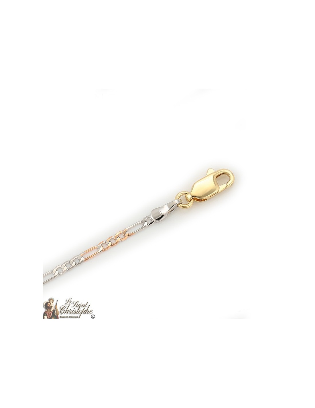 Figaro-ketting van 60 cm, verguld met geelgoud, roségoud en zilver met schakels van variabele grootte. Een asymmetrisch ontwerp in edele kleuren voor een moderne stijl.